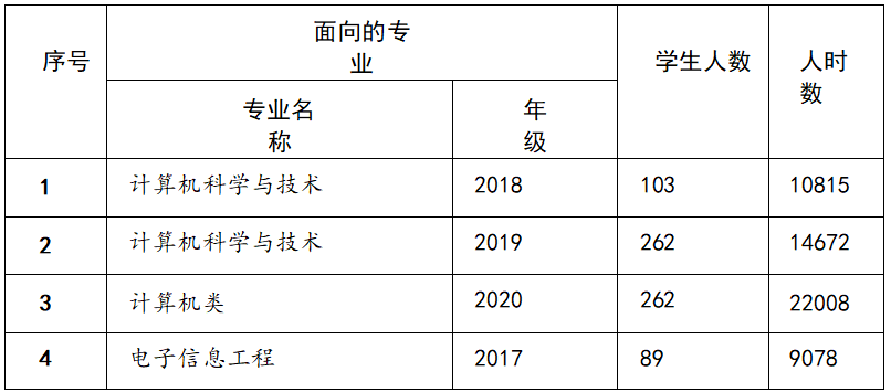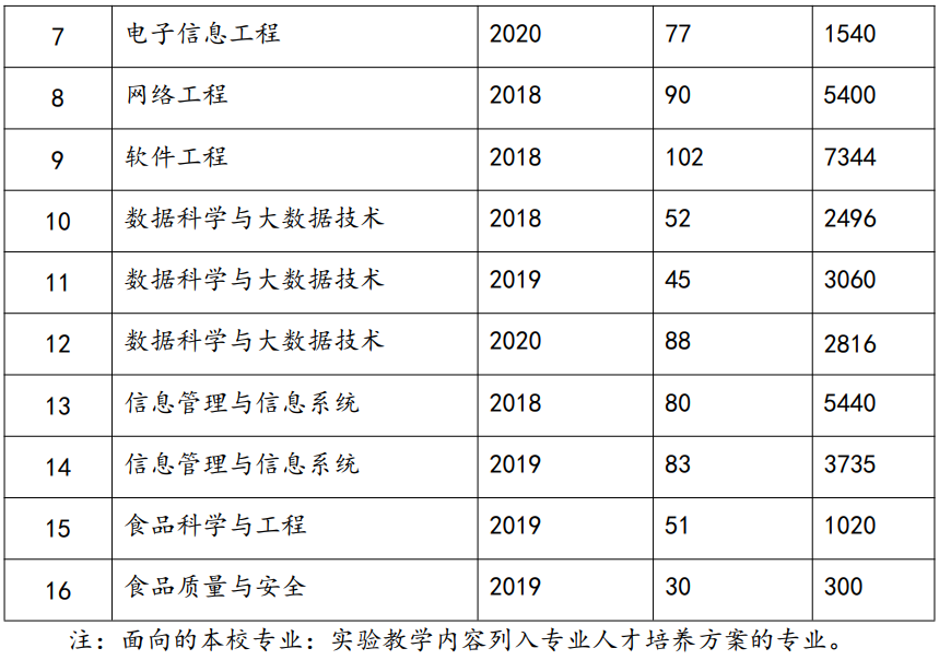 信息技术实验示范中心依托计算机科学与技术、软件工程、网络工程、电子信息工程、数据科学与大数据技术及人工智能等6个工科本科专业和计算机科学与技术一级硕士学位研究生专业建设,2020年在校生本科生1634人,研究生30人,为全体学生提供所有课程的课内外实验、专业实训、毕业设计及创新创业训练等环境,同时示范中心还为全校计算机相关专业课程的实践教学提供保障。