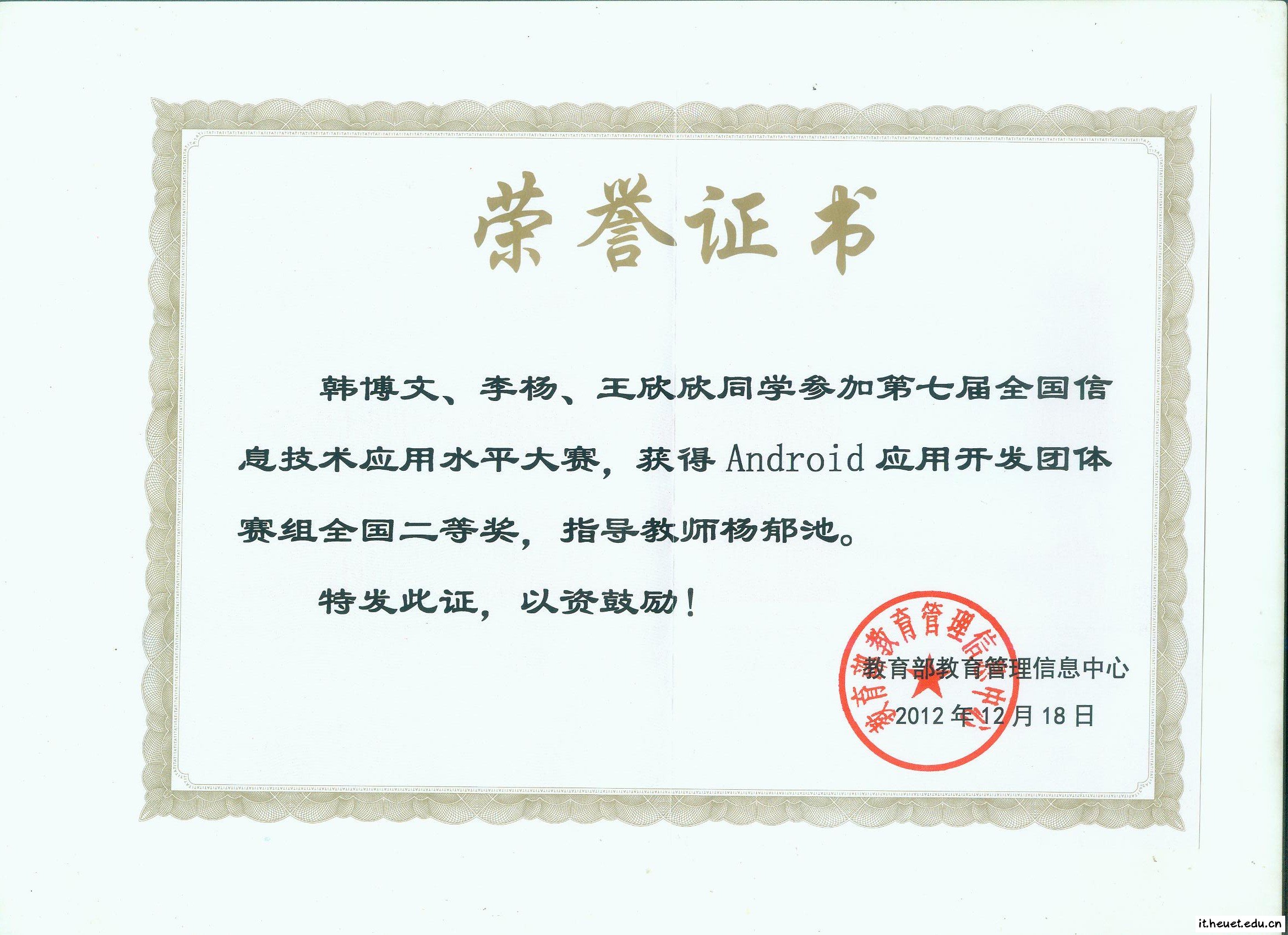 2012年12月15日-18日,第七届全国信息技术应用水平大赛总决赛在北京科技大学圆满落下帷幕。我院学生韩博文、李杨、王欣欣在大赛中表现突出,荣获Android应用开发团体赛组国家二等奖。